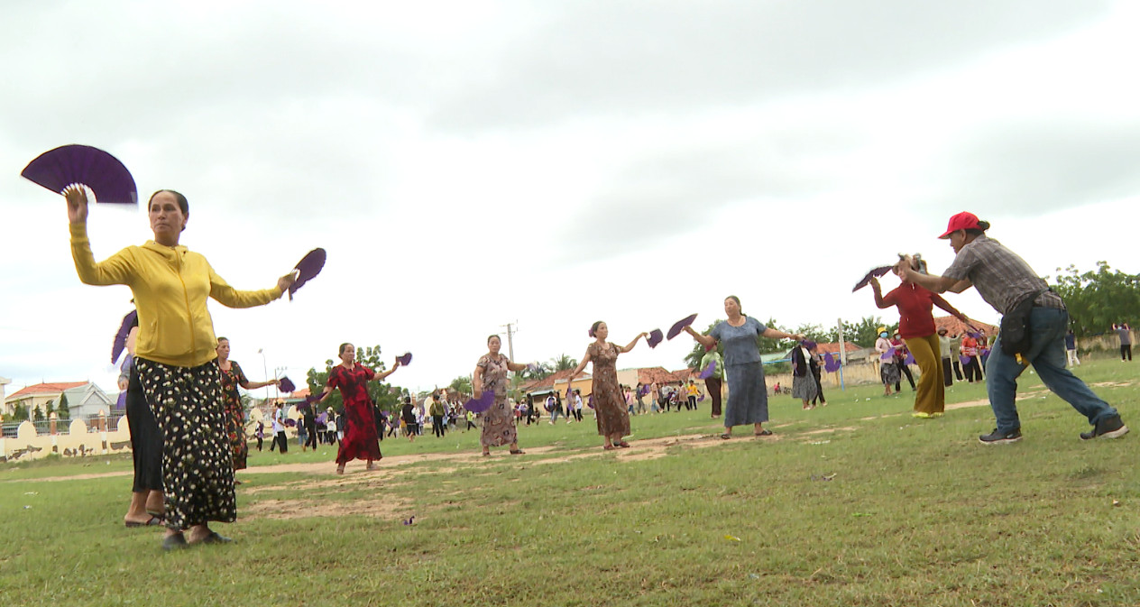 Người dân làng Chăm Hữu Đức tập đồng diễn múa quạt chuẩn bị đón Katê 2023.