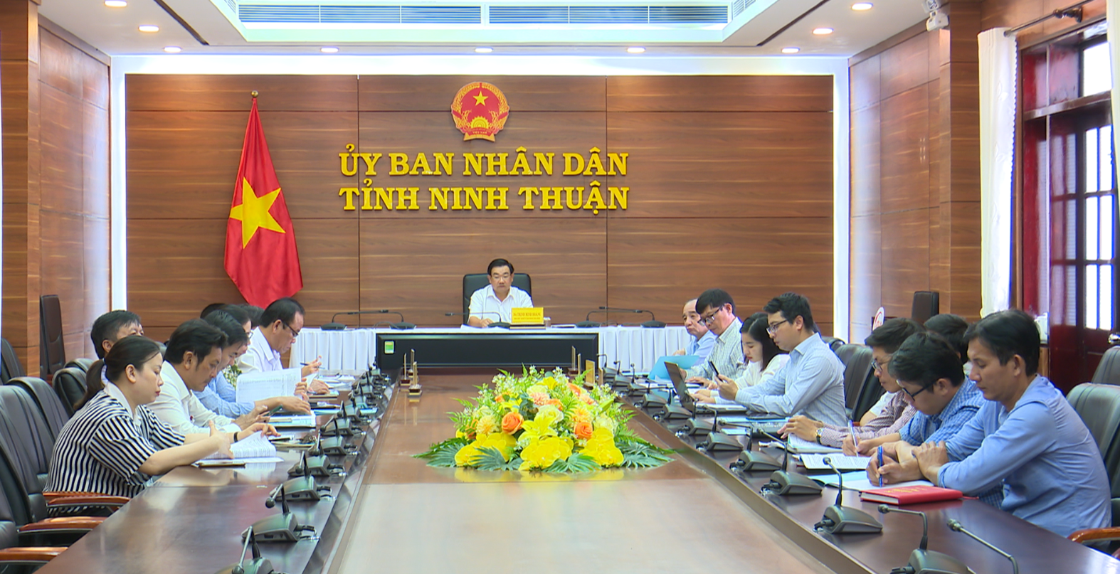 Đồng chí Trịnh Minh Hoàng, Phó Chủ tịch UBND tỉnh Ninh Thuận và các đại biểu dự hội nghị trực tuyến tại điểm cầu Ninh Thuận.