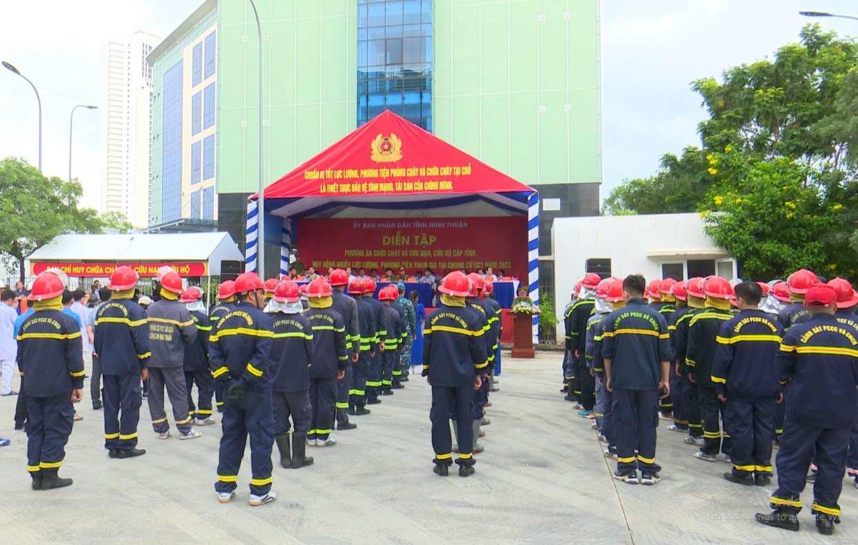 Theo tình huống giả định, vào hồi 8 giờ ngày 21/10/2023, tại Chung cư CC1 xảy ra cháy. Sau khi nhận được tin báo, Phòng Cảnh sát PCCC và CNCH, Công an tỉnh Ninh Thuận đã khẩn trương điều động toàn bộ lực lượng, phương tiện đến phối hợp với các lực lượng liên quan triển khai các phương án chữa cháy và cứu người bị nạn, hướng dẫn thoát nạn. Trong quá trình chữa cháy, nhận định đám cháy có quy mô lớn, Cục Cảnh sát PCCC và CNCH – Bộ Công an đã điều động lực lượng Cảnh sát PCCC và CNCH, Công an các tỉnh Khánh Hòa và Bình Thuận tham gia hỗ trợ chữa cháy, cứu nạn. Cuộc diễn tập đã huy động 34 xe chuyên dụng và phương tiện các loại với hơn 200 người tham gia chữa cháy và cứu nạn, cứu hộ. Sau gần 50 phút tổ chức chữa cháy và cứu nạn, cứu hộ, đám cháy đã được dập tắt hoàn toàn, tổ chức hướng dẫn thoát nạn cho hơn 400 người và cứu được 50 người bị nạn ra nơi an toàn.