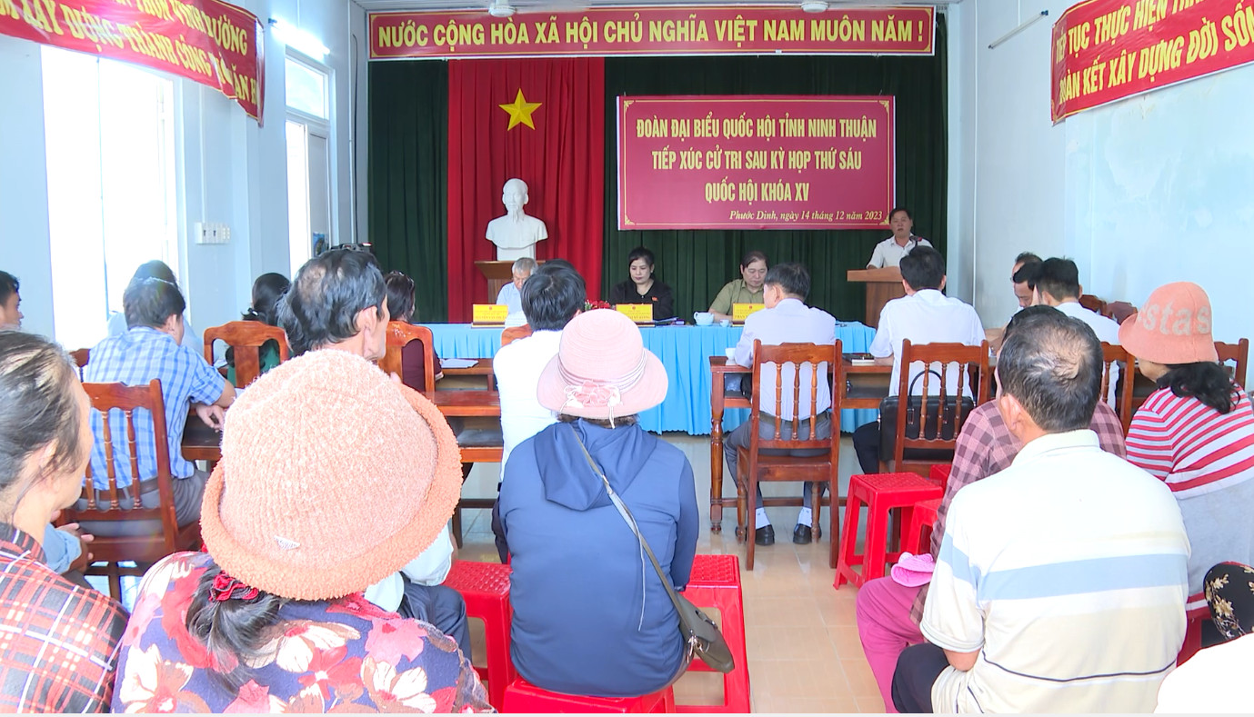 Chiều ngày 14/12/2023, Đoàn đại biểu quốc hội (ĐBQH) tỉnh Ninh Thuận, đơn vị bầu cử số 2 gồm: Bà Đàng Thị Mỹ Hương, Phó Trưởng đoàn ĐBQH tỉnh Ninh Thuận; ông Phan Xuân Dũng, Chủ tịch Liên hiệp Các hội khoa học và kỹ thuật Việt Nam và ông Nguyễn Văn Thuận, Chủ tịch Hội Cựu chiến binh tỉnh đã tiếp xúc cử tri xã Phước Dinh, huyện Thuận Nam, Ninh Thuận.