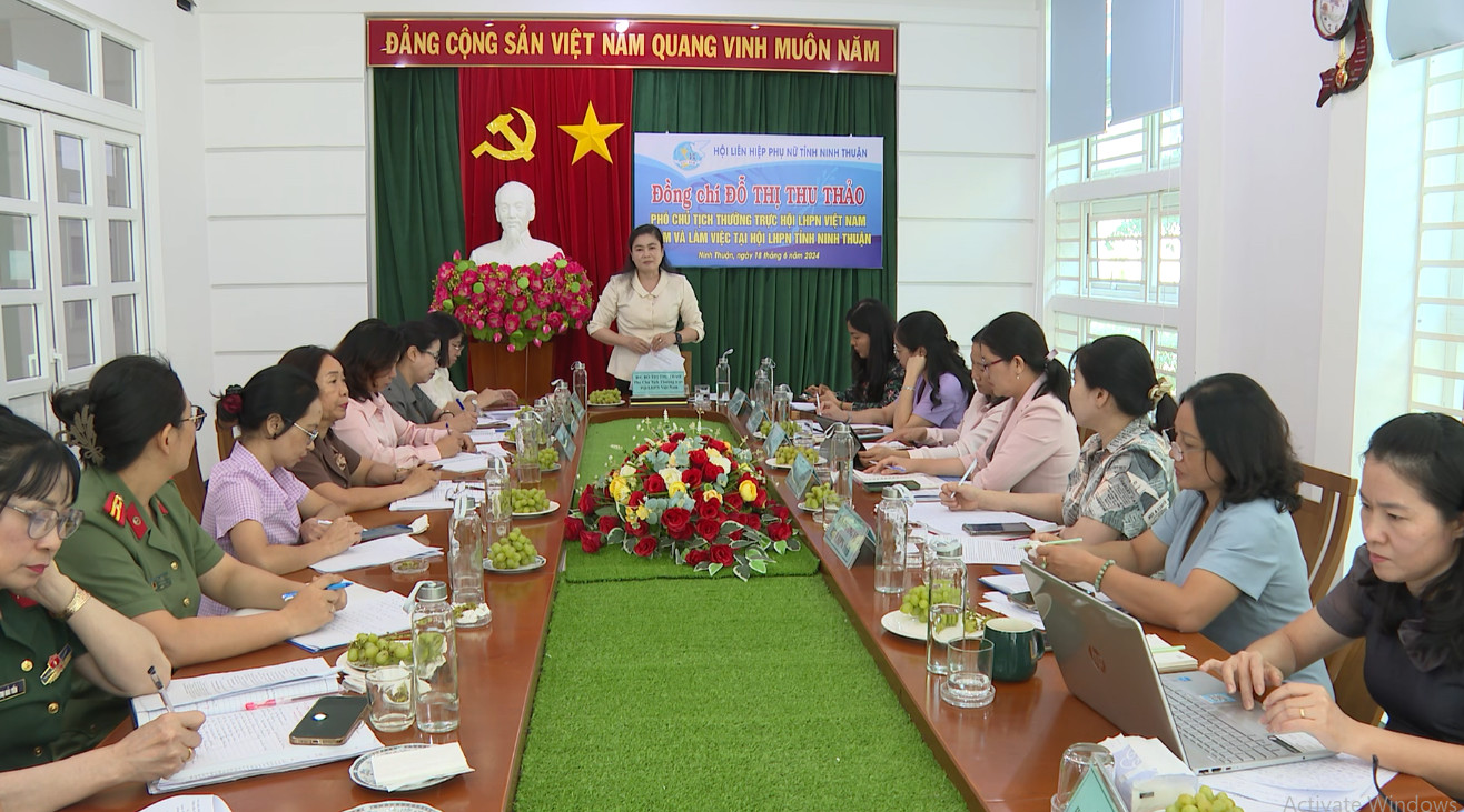 Sáng ngày 18/6/2024, đồng chí Đỗ Thị Thu Thảo, Phó Chủ tịch Thường trực Trung ương Hội Liên hiệp phụ nữ Việt Nam đã làm việc với Hội Liên hiệp phụ nữ tỉnh Ninh Thuận về kết quả nửa nhiệm kỳ thực hiện Nghị quyết Đại hội đại biểu Hội Liên hiệp phụ nữ tỉnh lần thứ XII, nhiệm kỳ 2021 – 2026.