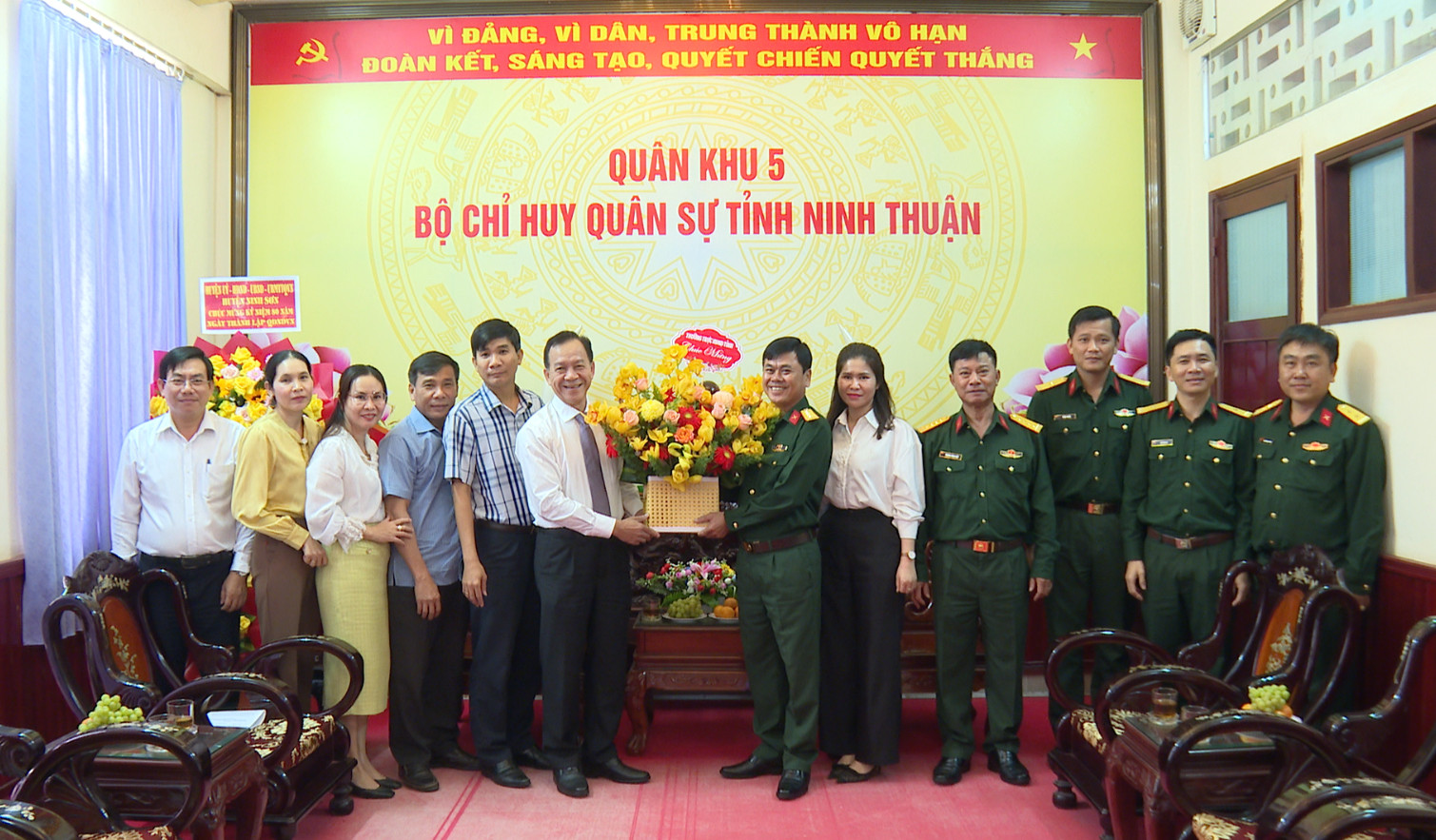 Đồng chí Trần Minh Lực, Ủy viên Thường vụ Tỉnh ủy, Phó Chủ tịch HĐND tỉnh Ninh Thuận thăm, tặng hoa chúc mừng cán bộ, chiến sĩ Bộ Chỉ huy Quân sự tỉnh Ninh Thuận.