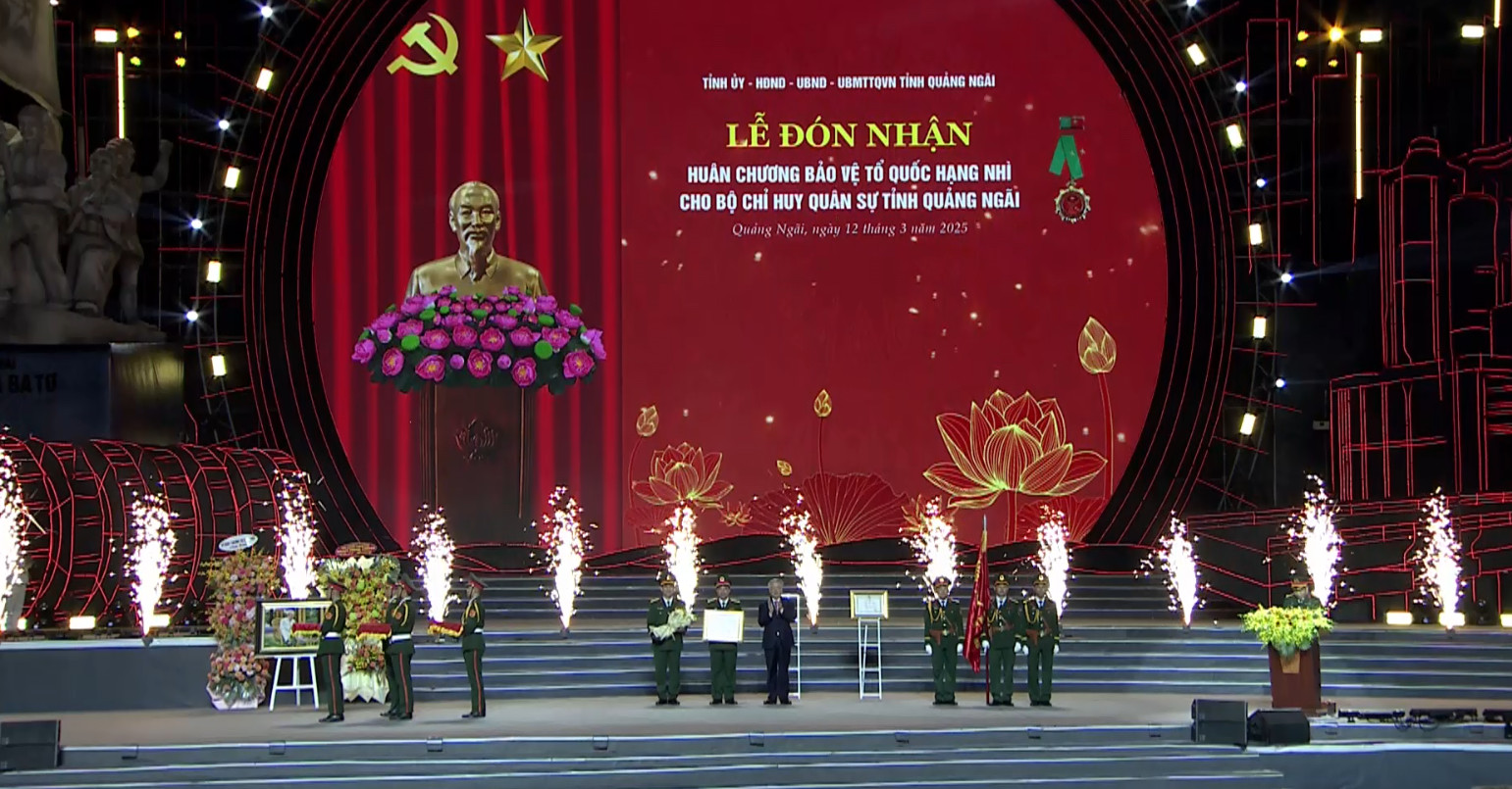 Phó Thủ tướng Thường trực Chính phủ Nguyễn Hòa Bình trao Huân chương Bảo vệ Tổ quốc hạng Nhì cho Bộ Chỉ huy Quân sự tỉnh Quảng Ngãi.