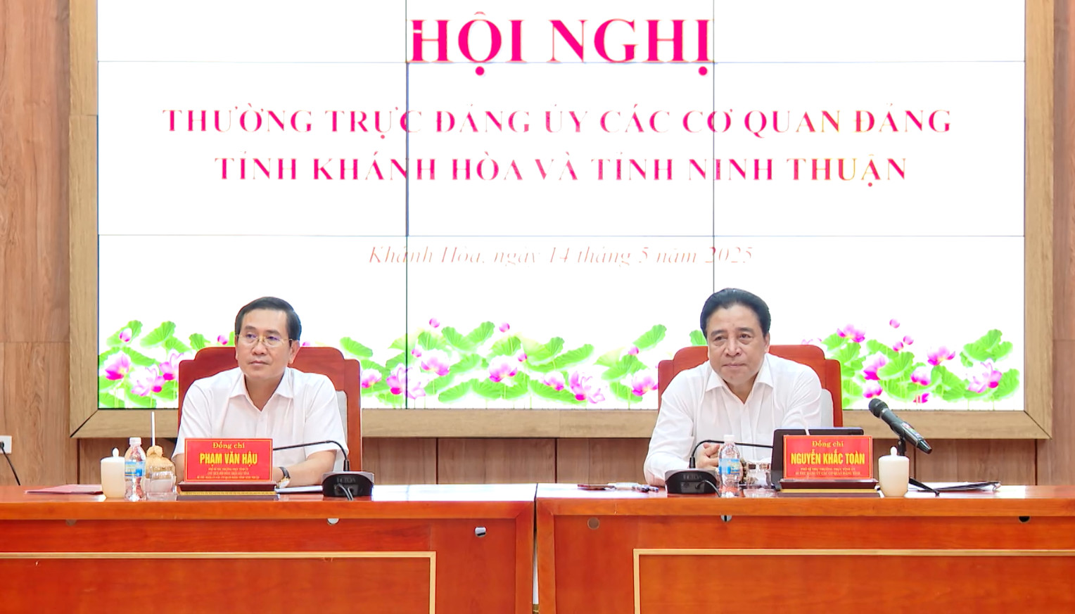 Chiều ngày 14/5/2025, tại Hội trường Tỉnh ủy Khánh Hòa, Ban Thường vụ Đảng ủy Các cơ quan Đảng tỉnh Khánh Hòa và Ban Thường vụ Đảng ủy Các cơ quan Đảng tỉnh Ninh Thuận tổ chức Hội nghị làm việc, thống nhất chủ trương hợp nhất tổ chức Đảng giữa hai địa phương. Đồng chí Nguyễn Khắc Toàn, Phó Bí thư Thường trực Tỉnh uỷ, Chủ tịch HĐND tỉnh, Bí thư Đảng uỷ Các cơ quan Đảng tỉnh Khánh Hoà và đồng chí Phạm Văn Hậu, Phó Bí thư Thường trực Tỉnh uỷ, Chủ tịch HĐND tỉnh, Bí thư Đảng uỷ Các cơ quan Đảng tỉnh Ninh Thuận đồng chủ trì hội nghị.