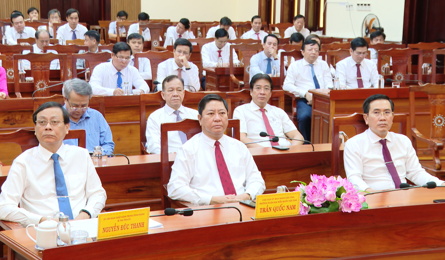 Đồng chí Nguyễn Đức Thanh, Ủy viên Trung ương Đảng, Bí thư Tỉnh ủy; đồng chí Phạm Văn Hậu, Phó Bí thư Thường trực Tỉnh ủy, Chủ tịch HĐND tỉnh; đồng chí Trần Quốc Nam, Phó Bí thư Tỉnh ủy, Chủ tịch UBND tỉnh tại hội nghị.