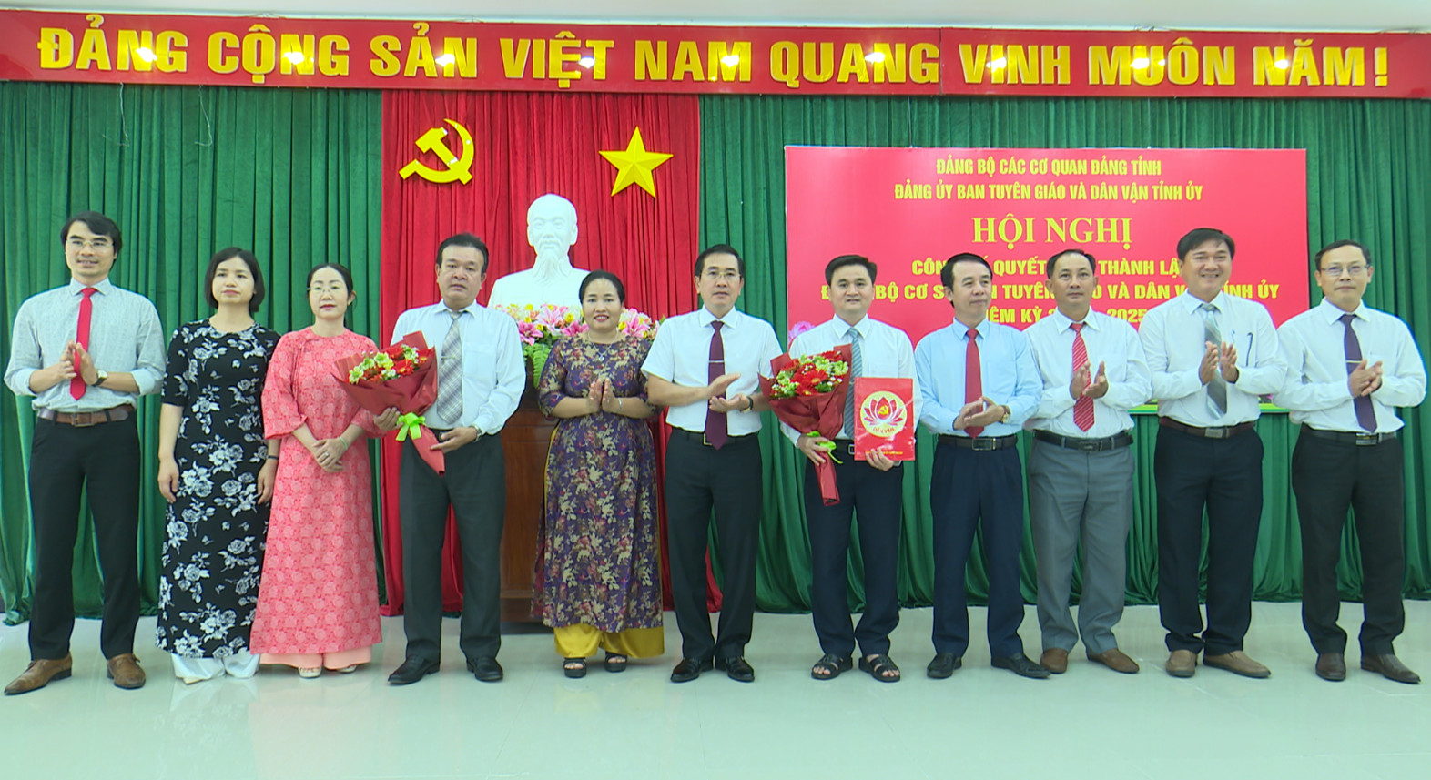 Đồng chí Phạm Văn Hậu, Phó Bí thư Thường trực Tỉnh uỷ, Chủ tịch HĐND tỉnh, Bí thư Đảng ủy các cơ quan Đảng tỉnh Ninh Thuận trao Quyết định thành lập Đảng bộ cơ sở Ban Tuyên giáo và Dân vận Tỉnh uỷ Ninh Thuận và tặng hoa chúc mừng.
