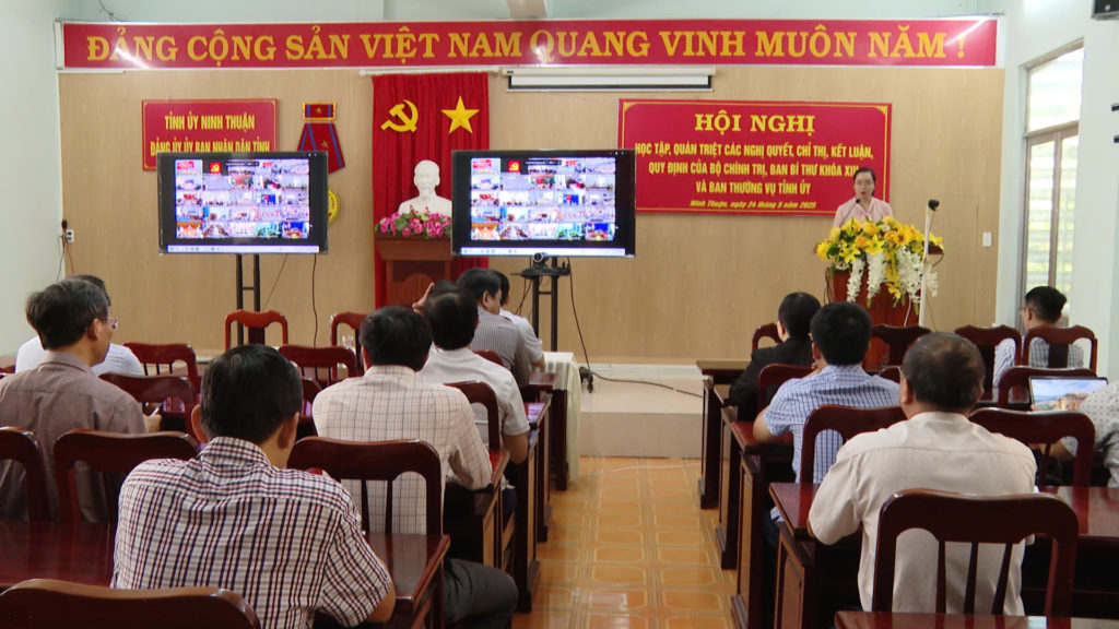 Sáng ngày 24/5/2025, Đảng ủy UBND tỉnh Ninh Thuận tổ chức Hội nghị học tập, quán triệt các Nghị quyết, Chỉ thị, Kết luận, Quy định của Bộ Chính trị, Ban Bí thư và Ban Thường vụ Tỉnh ủy Ninh Thuận đến cấp ủy các chi, đảng bộ trực thuộc. Hội nghị được kết nối trực tuyến đến điểm cầu các chi, đảng bộ cơ sở thuộc Đảng bộ UBND tỉnh Ninh Thuận.