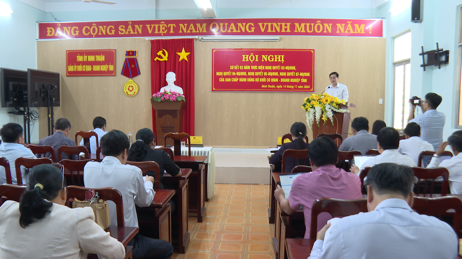 Sáng ngày 14/11/2024, Đảng bộ khối Cơ quan – Doanh nghiệp tỉnh Ninh Thuân tổ chức hội nghị Ban Chấp hành Đảng bộ Khối (mở rộng) Sơ kết 03 năm thực hiện Nghị quyết số 03 về “Nâng cao chất lượng công tác tổ chức, phục vụ hội nghị và công tác cung cấp, trao đổi thông tin trong Đảng bộ Khối”, Nghị quyết số 04 về “Đổi mới, nâng cao chất lượng học tập, quán triệt và triển khai thực hiện các Chỉ thị, Nghị quyết của cấp ủy Đảng các cấp trong toàn Đảng bộ Khối”, Nghị quyết số 05 về “Nâng cao hiệu quả hoạt động của các tổ chức cơ sở đảng và phát triển đảng viên mới” và Nghị quyết số 07 về “nâng cao chất lượng công tác giáo dục chính trị, tư tưởng, đạo đức, lối sống văn hóa cho cán bộ đoàn, đoàn viên thanh niên khối Cơ quan – Doanh nghiệp tỉnh Ninh Thuân, giai đoạn 2021-2026”.