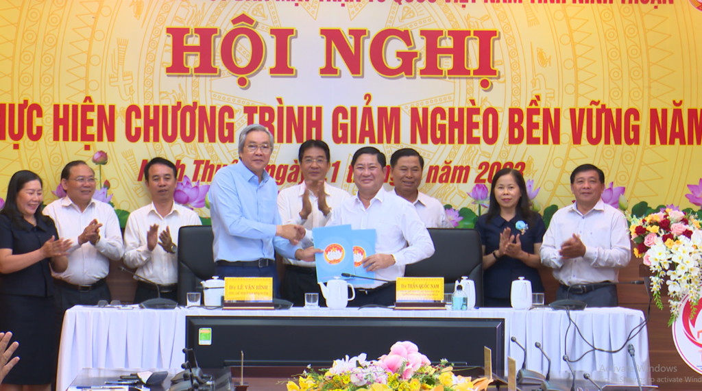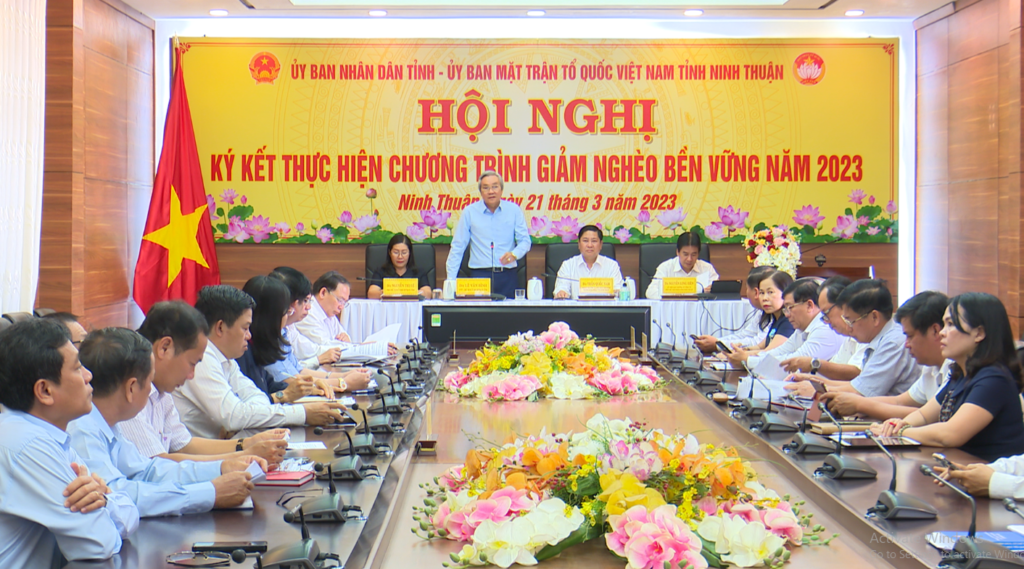 Thực hiện phong trào thi đua “Vì người nghèo – Không để ai bị bỏ lại phía sau” giai đoạn 2021 – 2025 trên địa bàn tỉnh Ninh Thuận, chiều ngày 21/3/2023, Ủy ban nhân dân (UBND) tỉnh Ninh Thuận phối hợp Ban Thường trực Ủy ban Mặt trận Tổ quốc Việt Nam (UBMTTQVN) tỉnh Ninh Thuận tổ chức hội nghị triển khai kế hoạch phối hợp mỗi xã, phường, thị trấn xây dựng 1 mô hình sinh kế góp phần thực hiện mục tiêu giảm nghèo bền vững, giai đoạn 2023 – 2025 và ký kết các Chương trình phối hợp giảm nghèo bền vững năm 2023 bằng hình thức trực tiếp và trực tuyến. Đồng chí Trần Quốc Nam, Chủ tịch UBND tỉnh Ninh Thuận và đồng chí Lê Văn Bình – Ủy viên thường vụ Tỉnh ủy, Chủ tịch UBMTTQVN tỉnh Ninh Thuận đồng chủ trì hội nghị. Dự Hội nghị có đồng chí Nguyễn Long Biên – Ủy viên thường vụ Tỉnh ủy, Phó Chủ tịch UBND tỉnh Ninh Thuận; Thường trực UBMTTQVN tỉnh Ninh Thuận; đại diện lãnh đạo Sở, ngành, đoàn thể cấp tỉnh; lãnh đạo các huyện, thành phố.