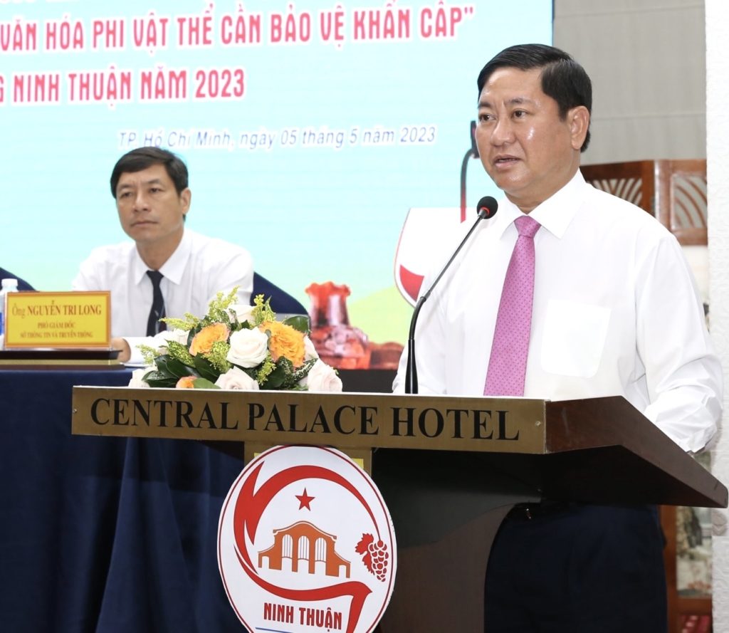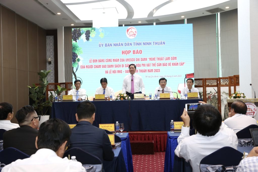 Chiều ngày 05/5/2023, tại thành phố Hồ Chí Minh, Ủy ban nhân dân (UBND) tỉnh Ninh Thuận đã tổ chức Họp báo cung cấp thông tin về “Lễ đón Bằng công nhận của UNESCO ghi danh Nghệ thuật làm gốm của người Chăm vào Danh sách di sản văn hóa phi vật thể cần bảo vệ khẩn cấp và Lễ hội Nho – Vang Ninh Thuận năm 2023”. Dự buổi họp báo có đồng chí Trần Quốc Nam – Phó Bí thư Tỉnh ủy, Chủ tịch UBND tỉnh Ninh Thuận; đồng chí Nguyễn Long Biên – Ủy viên thường vụ Tỉnh ủy, Phó Chủ tịch UBND tỉnh; lãnh đạo các Sở, ngành của tỉnh, đại diện hơn 60 cơ quan báo chí và doanh nghiệp lữ hành khu vực thành phố Hồ Chí Minh và các tỉnh phía Nam.