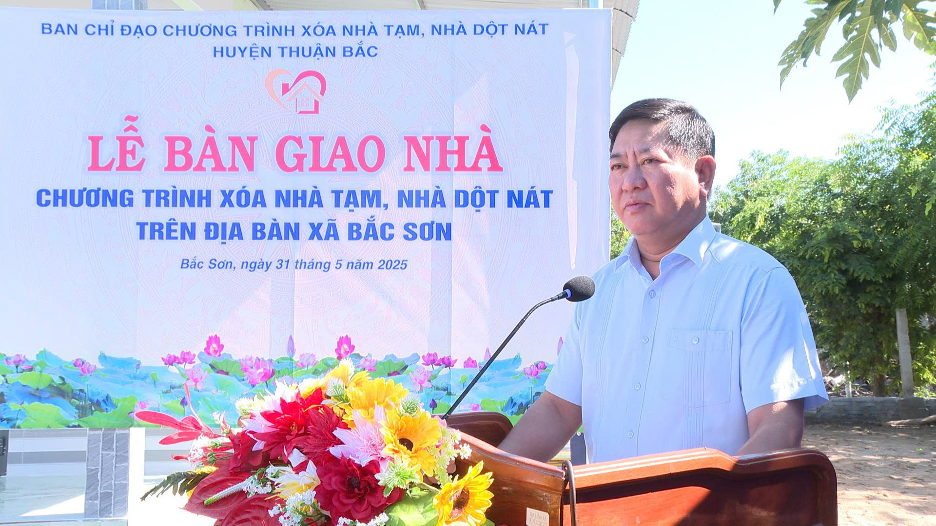 Sáng ngày 31/5/2025, Ban Chỉ đạo triển khai xóa nhà tạm, nhà dột nát huyện Thuận Bắc tổ chức Lễ bàn giao nhà Chương trình xóa nhà tạm, nhà dột nát trên địa bàn xã Bắc Sơn. Đến dự có đồng chí Trần Quốc Nam, Phó Bí thư Tỉnh ủy, Chủ tịch UBND tỉnh Ninh Thuận, Phó Trưởng Ban Thường trực Ban Chỉ đạo triển khai xóa nhà tạm, nhà dột nát tỉnh; đồng chí Chamaléa Thị Thủy, Ủy viên Thường vụ Tỉnh ủy, Trưởng Ban Tuyên giáo và Dân vận Tỉnh ủy.