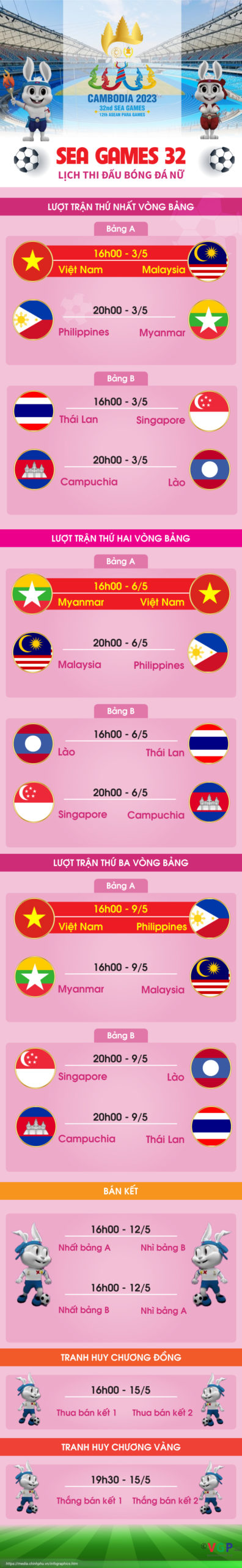 Theo lịch thi đấu ban tổ chức SEA Games 32 cập nhật, đội tuyển nữ Việt Nam sẽ mở màn gặp đội tuyển nữ Malaysia vào ngày 3/5 trước khi gặp hai đối thủ Myanmar và Philippines vào ngày 6/5 và 9/5 tại hai sân vận động Army và Smart RSN (Campuchia).