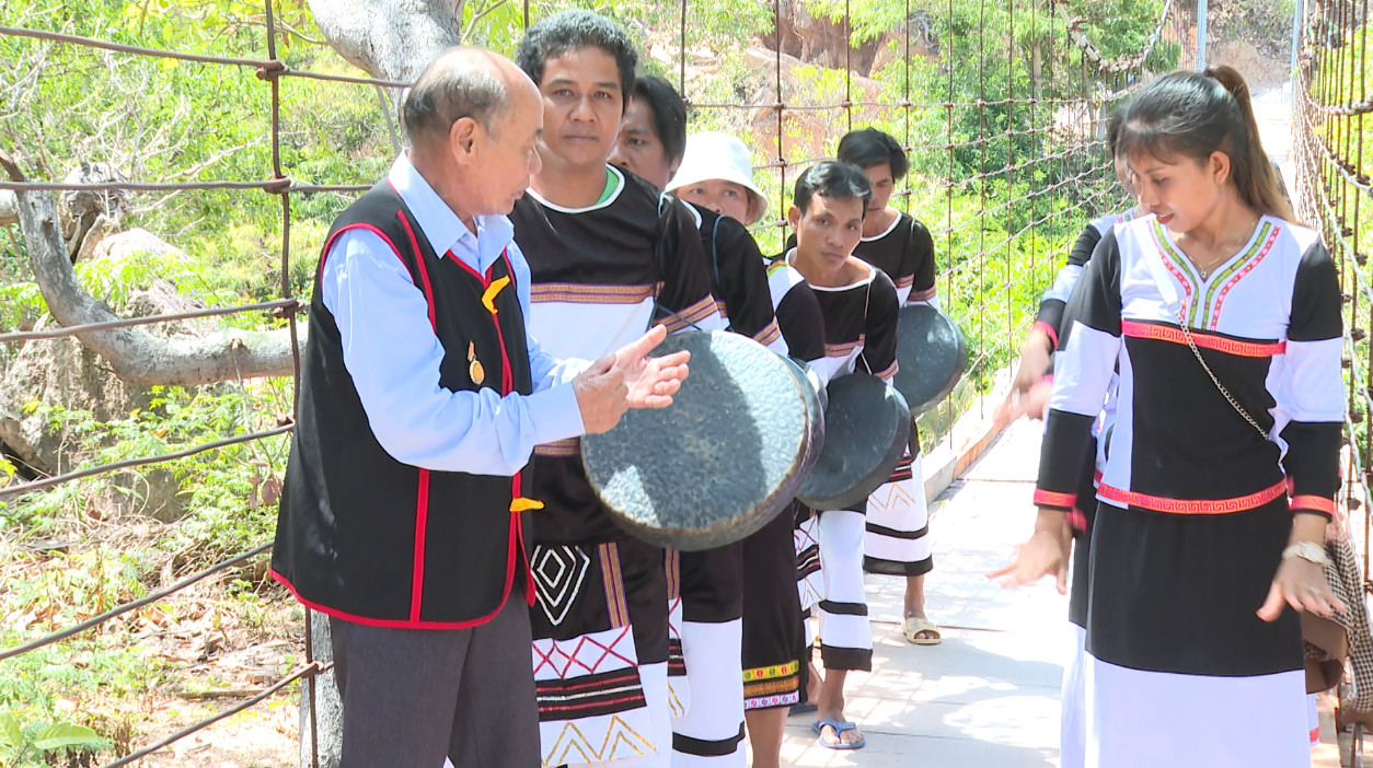 Nghệ nhân ưu tú Chamaléa Thơm truyền dạy sử dụng nhạc cụ Mã la cho người dân thôn Cầu Gãy, Đá Hang, xã Vĩnh Hải, huyện Ninh Hải