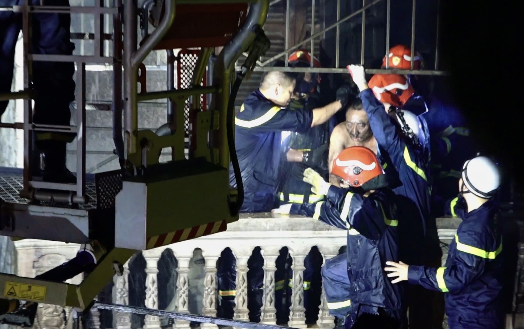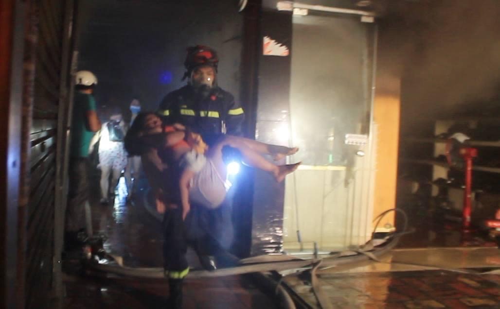 Hình ảnh do nhà báo Huy Mạnh ghi lại cảnh cảnh sát cứu 2 mẹ con trong vụ cháy tại Thanh Xuân Bắc.