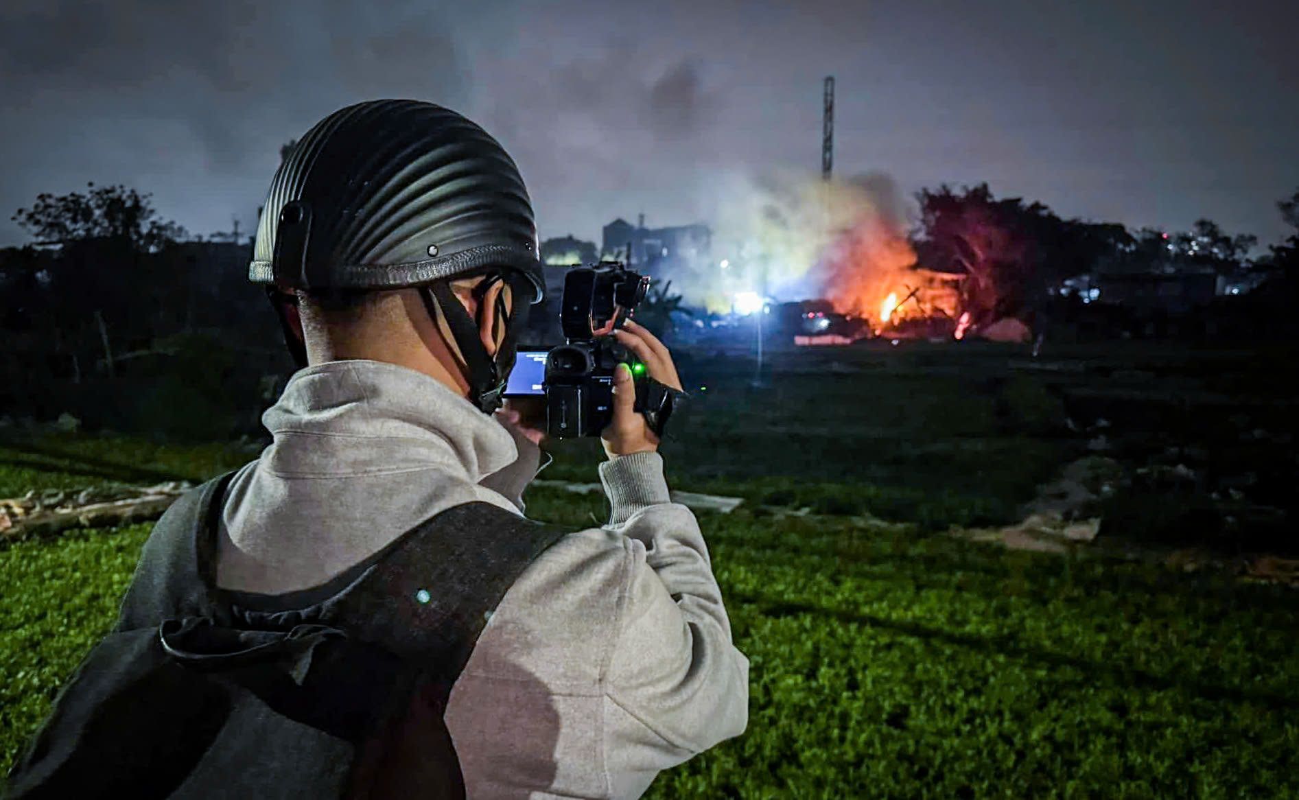 Nhà báo Huy Mạnh tác nghiệp tại một vụ cháy ở Hà Nội.