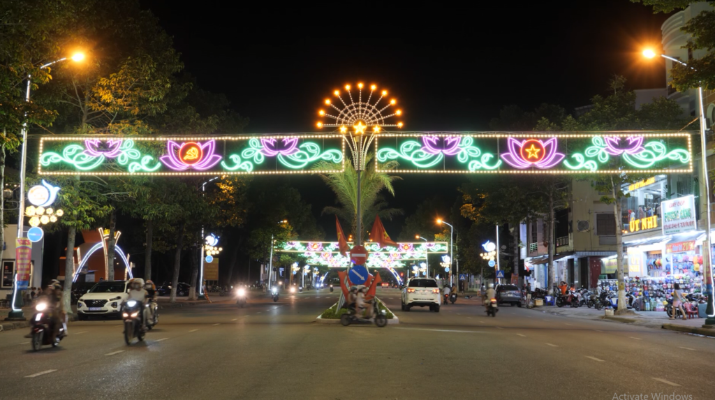 Ban đêm tuyến đường 16/4 rực rỡ ánh đèn với các họa tiết đặc trưng của vùng đất “nắng, gió”. Khu vực Tượng đài, Bảo tàng, Quảng trường 16/4 cũng rực sáng bằng hệ thống đèn trang trí, tạo ra diện mạo mới hiện đại, trẻ trung cho thành phố.