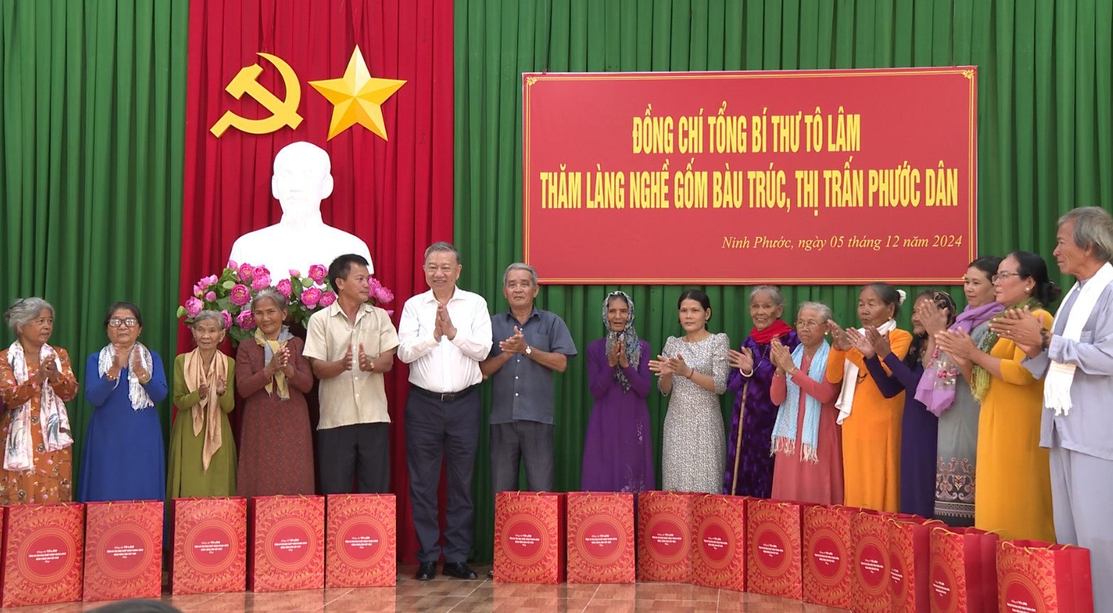 Nhân dịp này, Tổng Bí thư Tô Lâm đã tặng quà cho 20 hộ nghèo, hộ gia đình chính sách ở làng nghề gốm Bàu Trúc. Người dân làng gốm Bàu Trúc cũng tặng Tổng Bí thư Tô Lâm món quà lưu niệm là bình gốm Bàu Trúc.