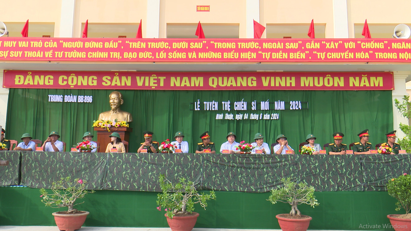 Sáng ngày 04/6/2024, Trung đoàn Bộ binh 896, Bộ Chỉ huy Quân sự tỉnh Ninh Thuận tổ chức Lễ tuyên thệ chiến sỹ mới năm 2024. Dự buổi lễ có các đồng chí Phạm Văn Hậu, Phó Bí thư Thường trực Tỉnh ủy, Chủ tịch Hội đồng nhân dân (HĐND) tỉnh Ninh Thuận; đồng chí Châu Thị Thanh Hà, Ủy viên Thường vụ Tỉnh ủy, Bí thư Thành ủy Phan Rang – Tháp Chàm; lãnh đạo, Chỉ huy các cơ quan đơn vị Lực lượng vũ trang tỉnh và lãnh đạo các địa phương trên địa bàn tỉnh Ninh Thuận.