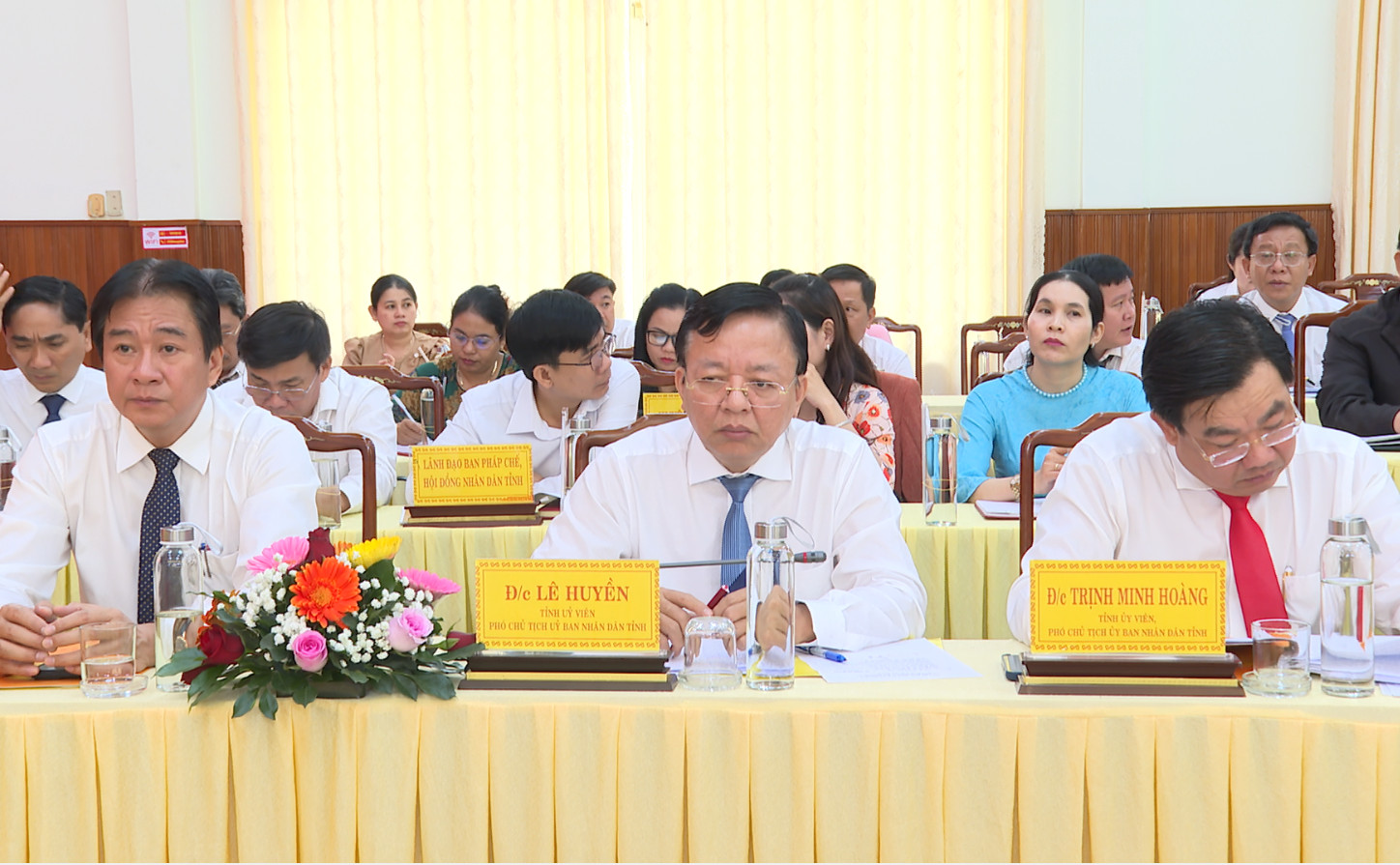Các đồng chí Phó Chủ tịch UBND tỉnh Ninh Thuận: Nguyễn Long Biên, Lê Huyền và Trịnh Minh Hoàng tại hội nghị.